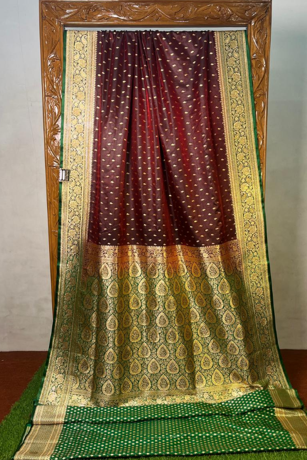 This saree has a beautiful zari border and excellent booti work, which gives it a traditional and royal look. If you are looking for something special for a wedding, festival or special occasion, then this saree is the best choice for you.
